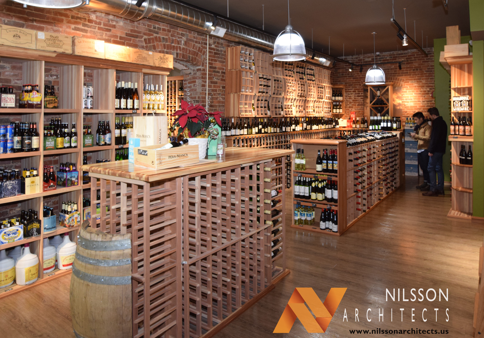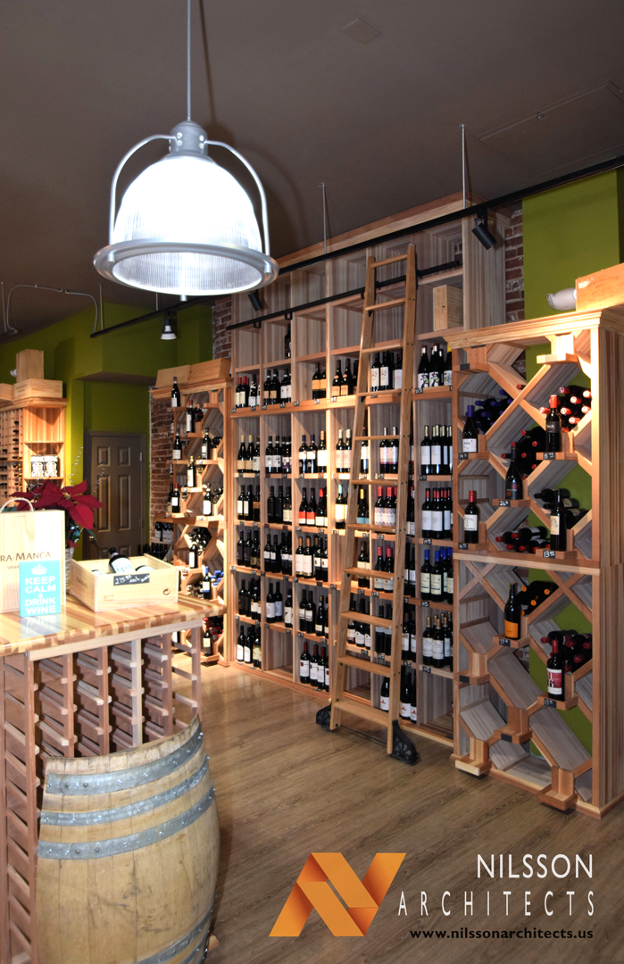 Traditional, old world charm with modern accents.  Custom wood wine display racks on exposed brick walls showcase over eight thousand product offerings.  Excellent design of movement and lighting make this space and effective retail environment. A delightfully charming, environment of European images and styles blended with local contemporary affects.  This boutique of craft offerings presents the very best of the old and new worlds.